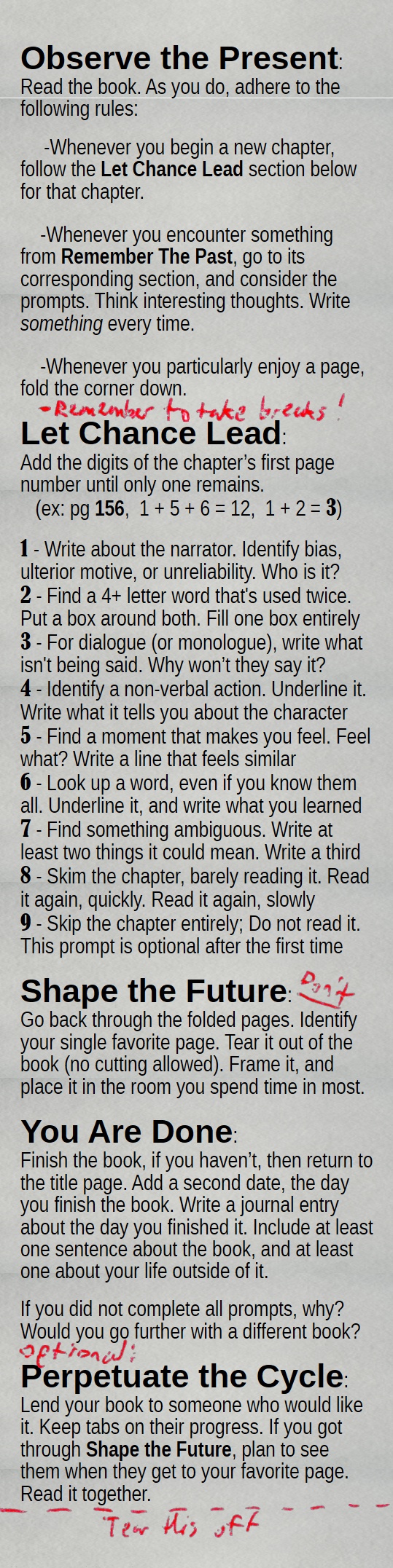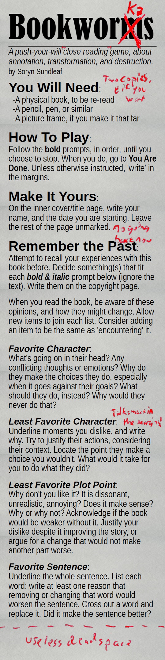 Bookwormks is a game around re-reading a book you love, and testing your willingness to write in it. Taking inspiration from close reading prompts, the game combines annotation practice with complications, from crossing out words to skipping entire chapters. This is a reading tool to make reading harder, and possibly lead to new insights as a result.